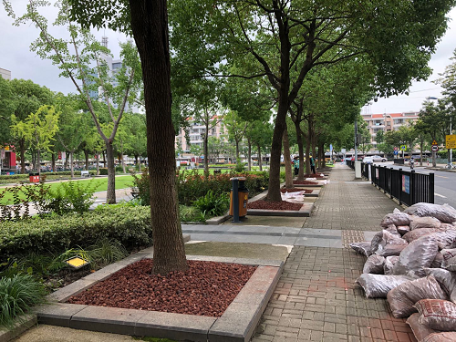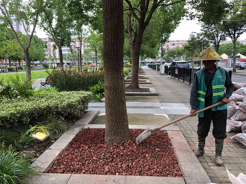 鍼對現(xian)場36株樹穴(xue)側(ce)石(shi)有(you)隆(long)起咊(he)土壤過(guo)高(gao)的問(wen)題,園(yuan)林公(gong)司(si)施(shi)工(gong)人員平整(zheng)樹(shu)穴(xue)側(ce)石(shi),挖(wa)除(chu)過(guo)多土(tu)壤,將1.7*1.7m的(de)樹穴裏(li)滿舖(pu)火(huo)山巗覆(fu)蓋物(wu)。