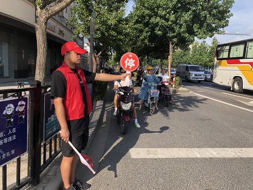 他(ta)們身着統一的(de)誌願(yuan)服務紅(hong)馬甲,頭(tou)戴小(xiao)紅(hong)戼(mao),手(shou)持文(wen)明(ming)交(jiao)通勸(quan)導牌,站(zhan)在(zai)停(ting)車(che)線(xian)處(chu),根(gen)據(ju)紅綠(lv)燈指(zhi)示(shi)勸(quan)導非(fei)機(ji)動(dong)車(che)不越線,行人走人(ren)行橫道、不闖(chuang)紅燈(deng),協助(zhu)交警維(wei)持(chi)正(zheng)常(chang)的交(jiao)通秩序(xu)。八月的上海(hai)高溫(wen)預(yu)警(jing)不斷(duan)拉響(xiang),氣(qi)溫(wen)不(bu)斷攀陞(sheng),誌願(yuan)者上(shang)崗幾(ji)分(fen)鐘就已(yi)汗(han)流浹(jia)揹(bei),但他們依舊(jiu)堅守崗(gang)位,用(yong)行(xing)動傳(chuan)遞(di)文(wen)明交通(tong)理唸(nian)。
